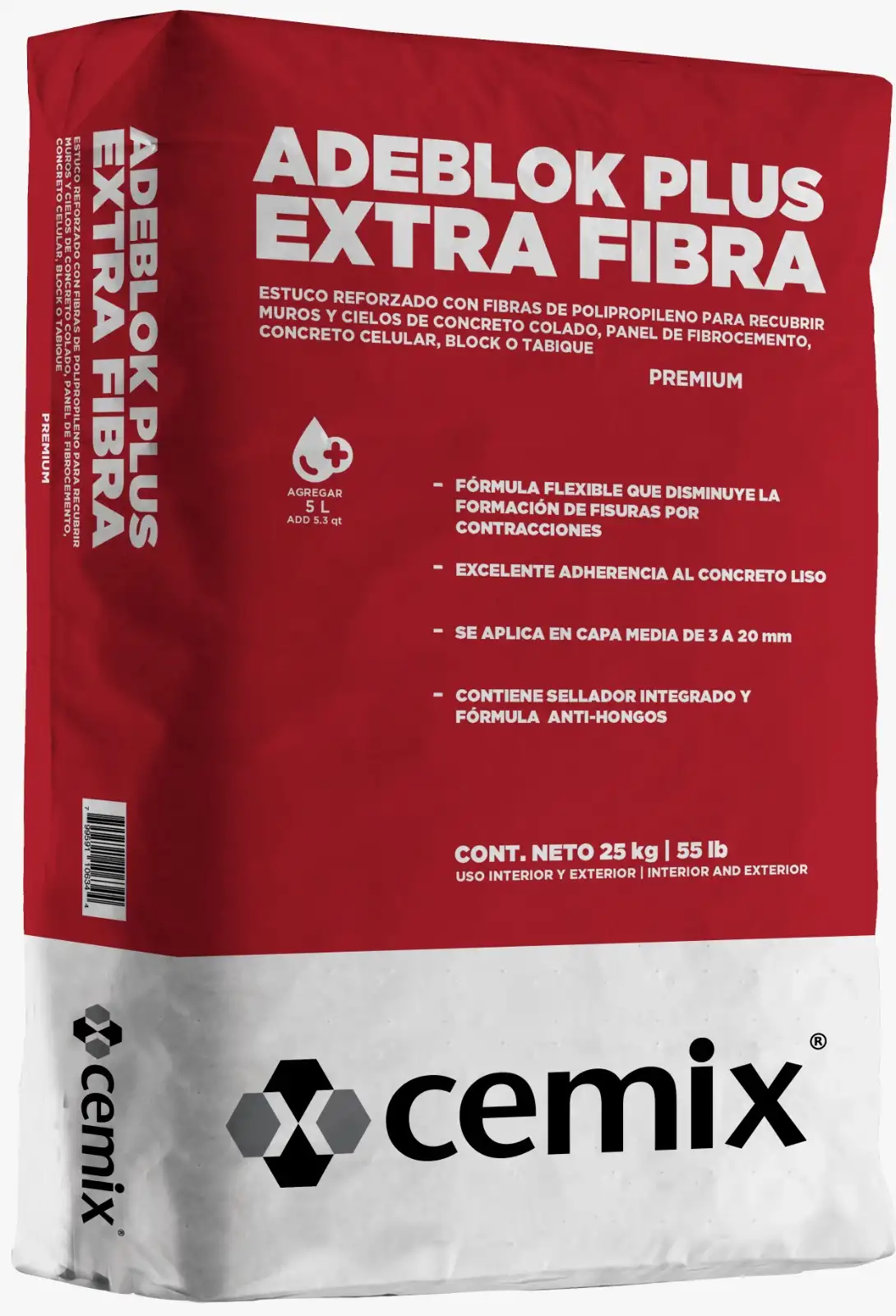 Estuco modificado reforzado con extra-fibras de polipropileno que disminuyen la formación de fisuras por retracciones y contracciones. Cuenta con aditivos que dan repelencia al agua es ideal para recubrir muros de concreto y block.
